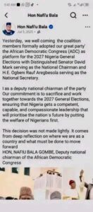 Nafiu confirmed coalition and called it a new political coalition that will prioritize Nigerian welfare.